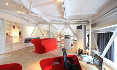 دفتر شانگهایِ استودیو معمار چینی Taranta Creation بازتابی ازفرایند خلاق مداوم در داخل استودیو است . تارانتا کرییشن ، این فضا با نام دفتر Red Town را برای کارمندان خود طراحی کرده . این نوع تفسیر رسمی از فضای اداری ، گرده افشانی متقابل را بین پروژه ها و رشته های مختلف ترغیب می کند . طبقه فوقانی مانند یک میز کار پیوسته ساخته شده که چهار حفره برای فضای نشستن ازدرون آن جدا شده و به عنوان یک فضای کار از طراحان دعوت می کند تا از فضا برای راه رفتن ، طراحی ، ملاقات ، مدل سازی ، فکرکردن ، تهیه پیش نویس ، نشستن و استراحت استفاده کنند . دو طبقه توسط یک ساختاری شبیه به "قطره آب" که راه پله درون آن قرار گرفته ، به هم متصل می شوند که از درون با رنگ قرمز و در بیرون با رنگ نقره ای پوشیده شده است .